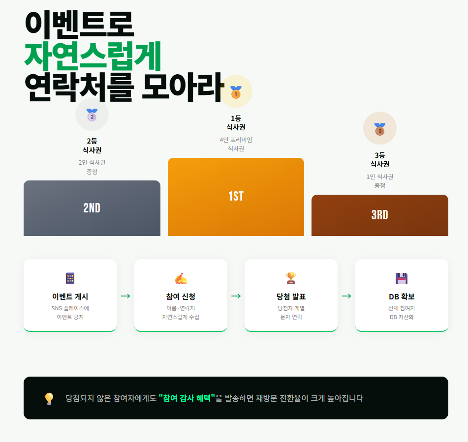 예를 들어 1등, 2등, 3등 식사 이벤트를 진행하면 자연스럽게 연락처를 확보할 수 있습니다.