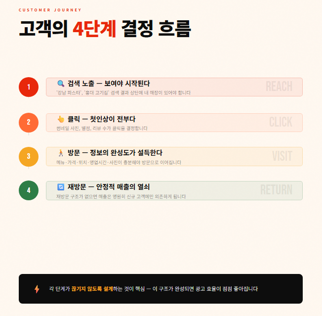 식당마케팅은 단순히 광고를 집행하는 것이 아니라 “검색 → 클릭 → 방문 → 재방문”까지 이어지는 흐름을 설계하는 것입니다.