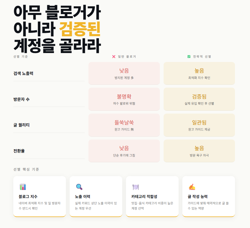 체험단을 활용할 때도 아무 블로거가 아니라 노출 가능성이 높은 계정을 선별해야 합니다.