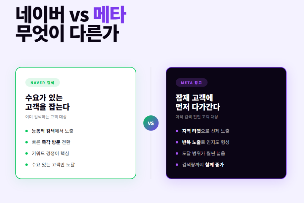 네이버 검색이 이미 수요가 있는 고객을 잡는 구조라면, 메타 광고는 아직 검색하지 않은 잠재 고객에게 먼저 노출되는 방식입니다.