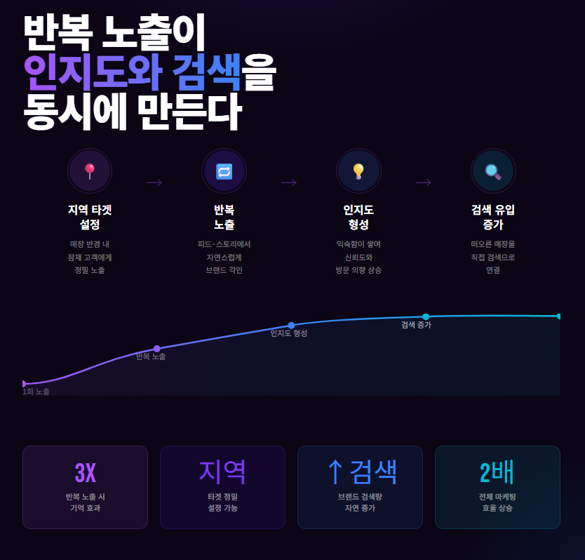 메타 광고는 지역 타겟으로 잠재 고객에게 반복 노출되어 인지도를 높이고, 결국 검색 유입까지 증가시키는 확장 전략입니다..